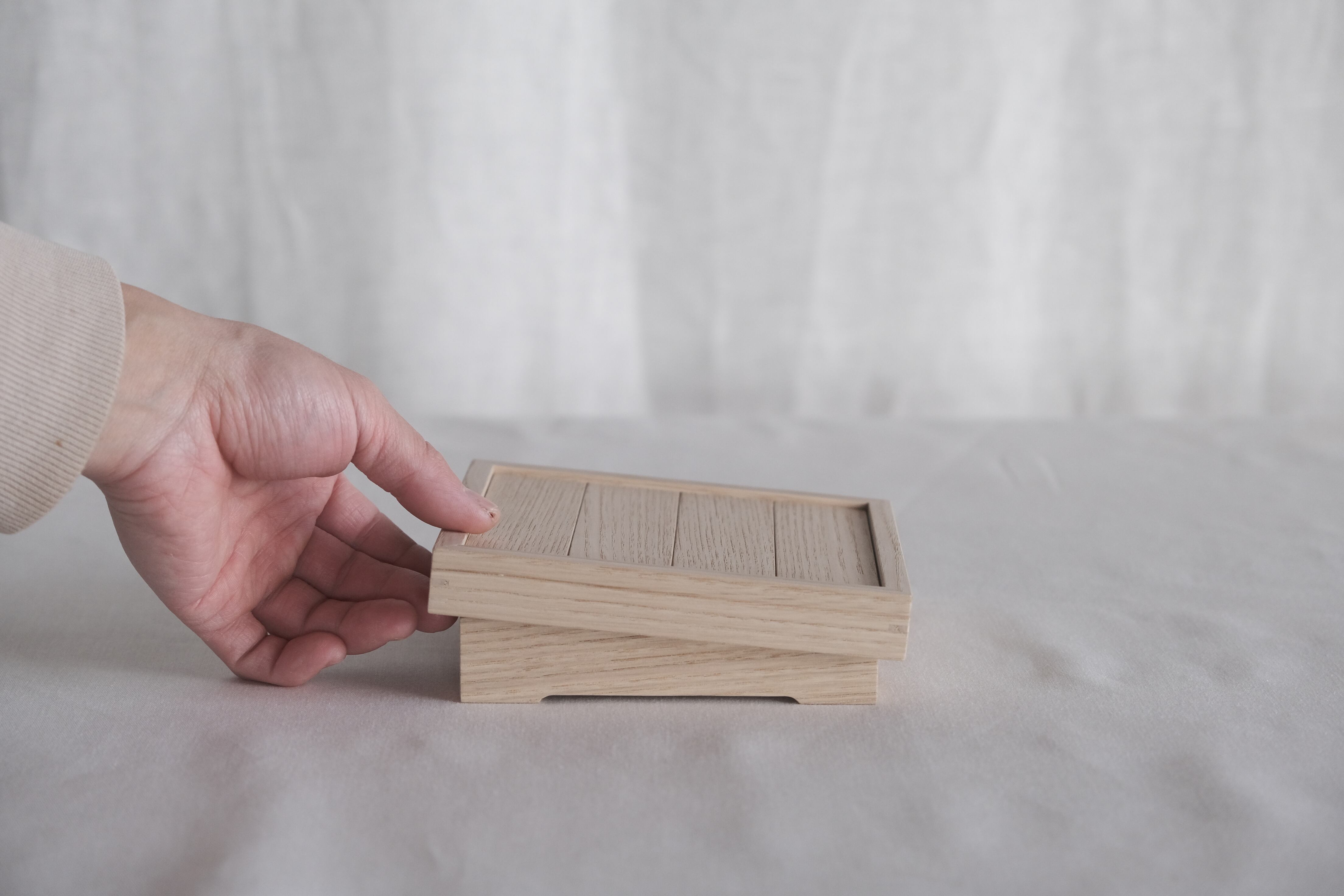 収納箱の蓋には、付属の脚をセットすることで飾り台としてお使いいただけます。コンパクトながらも洗練された佇まいが、どんな空間にも調和します。